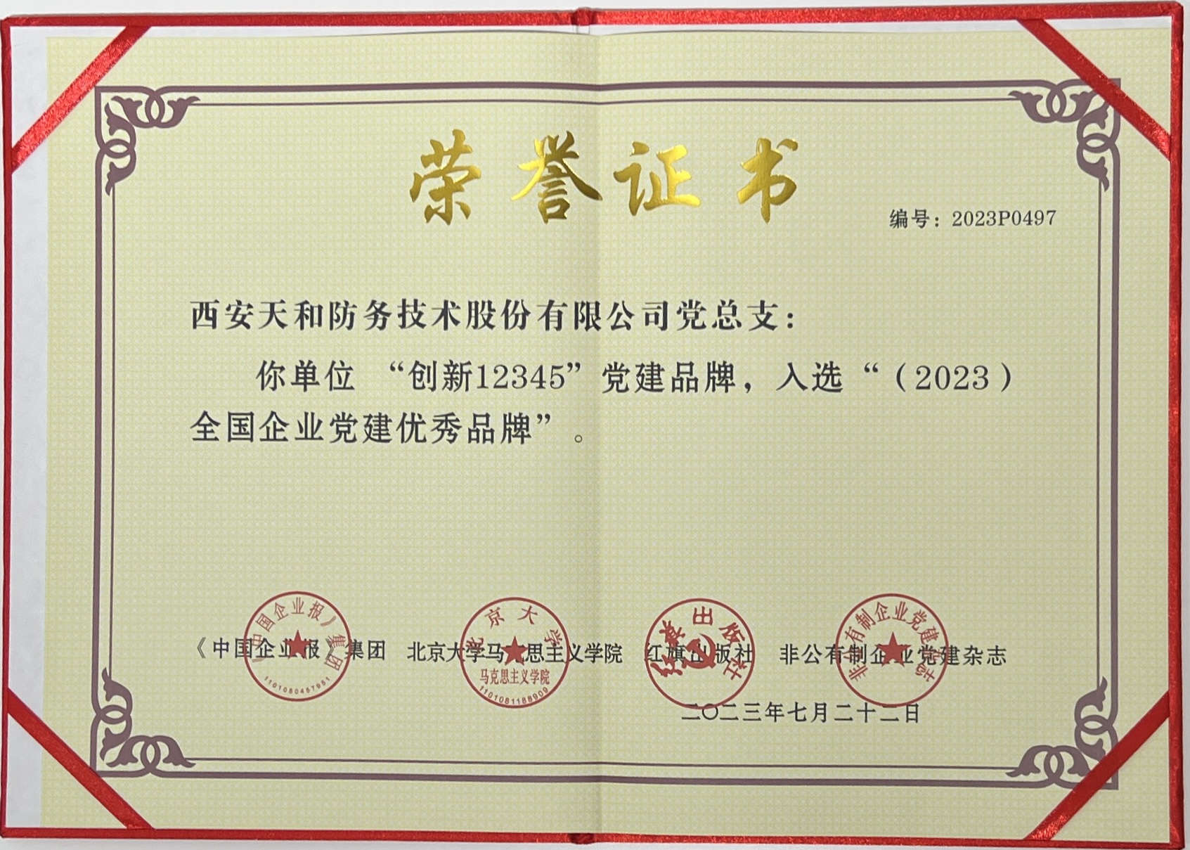 近日,由求實網(wǎng)指導(dǎo),《中國企業(yè)報》集團、北京馬克思主義學(xué)院、紅旗出版社共同主辦,中企黨建研究院承辦的2023全國企業(yè)黨建(案例)研討會暨第三屆企業(yè)黨建創(chuàng)新優(yōu)秀案例發(fā)布儀式在北京舉行。西安天和防務(wù)技術(shù)股份有限公司“12345”黨建品牌被評為“2023年全國企業(yè)黨建優(yōu)秀品牌”。