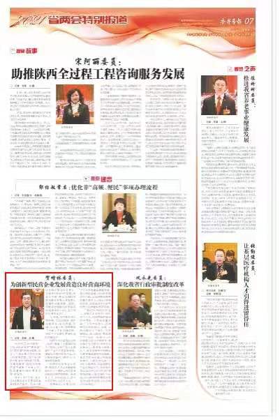 2021年1月29日,由陜西省政協(xié)主管、主辦的《各界導(dǎo)報(bào)》,以“賀增林委員:為創(chuàng)新型民營企業(yè)發(fā)展?fàn)I造良好營商環(huán)境”為題,對董事長賀增林政協(xié)提案進(jìn)行了報(bào)道?,F(xiàn)轉(zhuǎn)載如下: